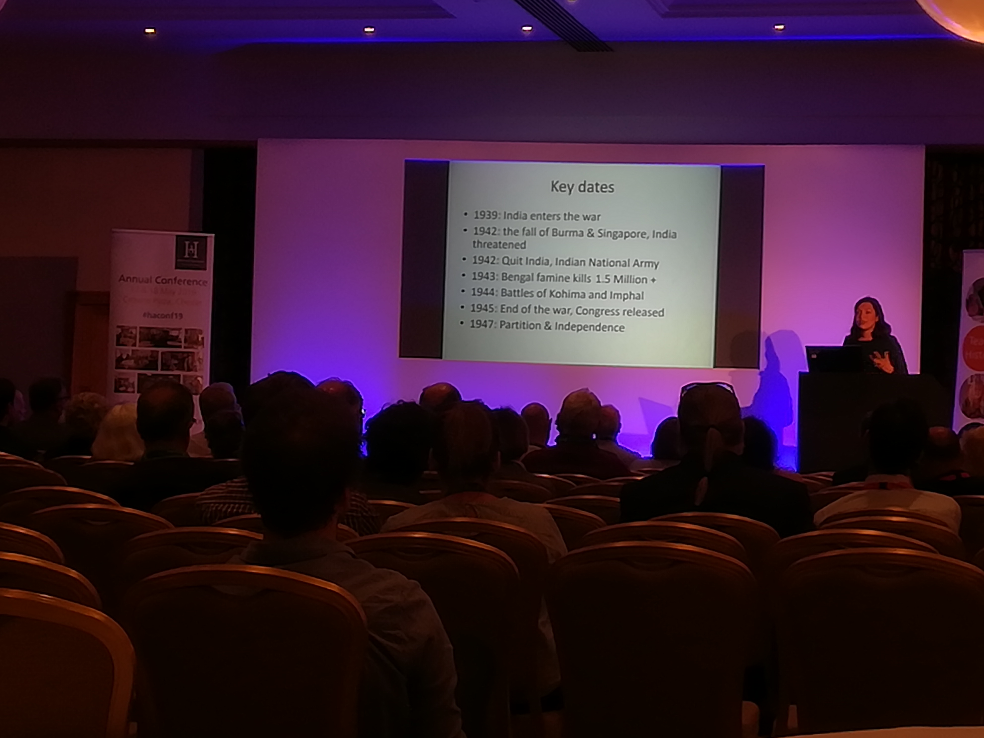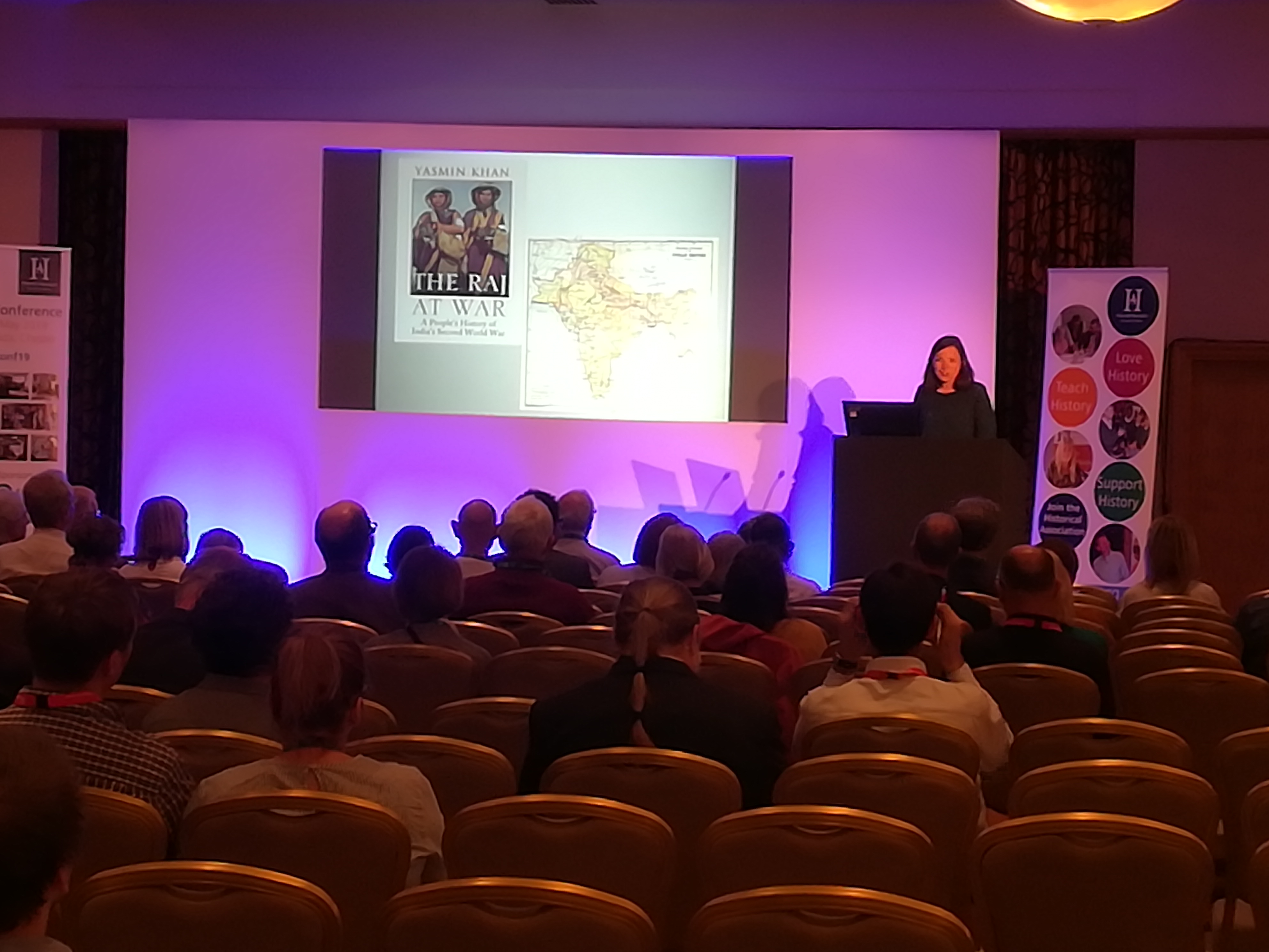 Friday evening’s keynote was given by Dr Yasmin Khan on ‘The Raj at War’. This session had resonances with Tim Grady’s lecture on the German Jews in the First World War, as it was based on commemorative work which wants to restore black and Asian voices to the narrative. Dr Khan pointed out that the publishers’ first version of her book had a man in a spitfire on the cover. She challenged the design, saying that she wanted to emphasise minority voices, and the published version now has an Imperial War Museum poster of two Indian women in the Home Guard.